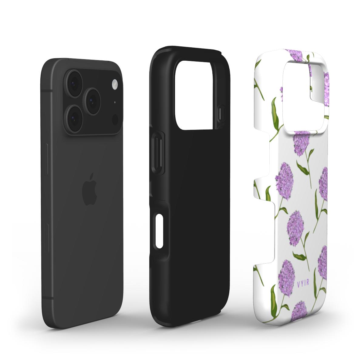 Spring Hydrangeas, flower pattern print phone case design in violet, purple and white colors.